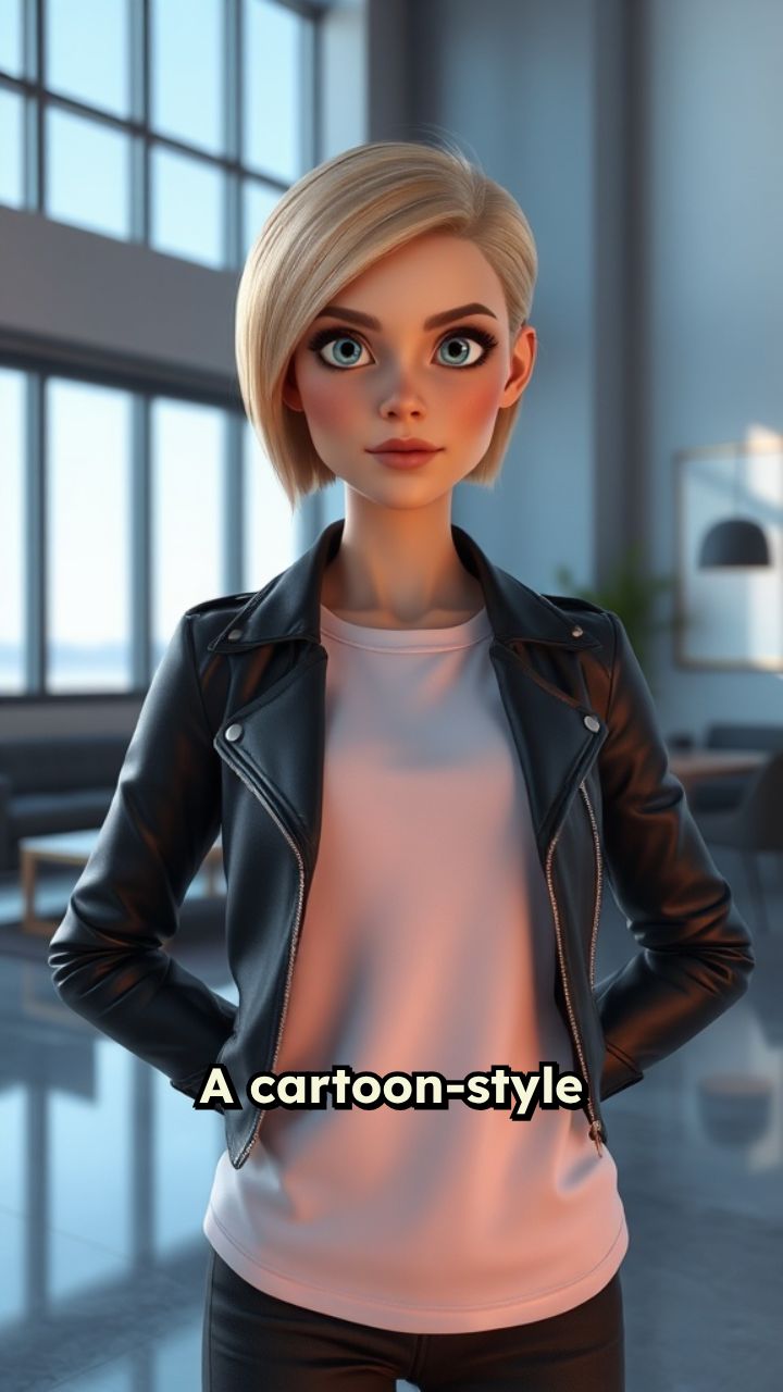 A cartoon-style scene depicting a confident woman standing in a modern, sleek room with