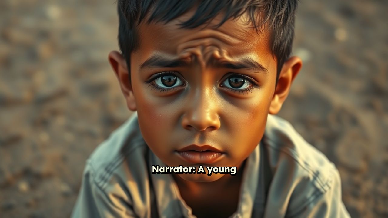Narrator: A young Muslim boy sits on the ground, his face covered in tears.