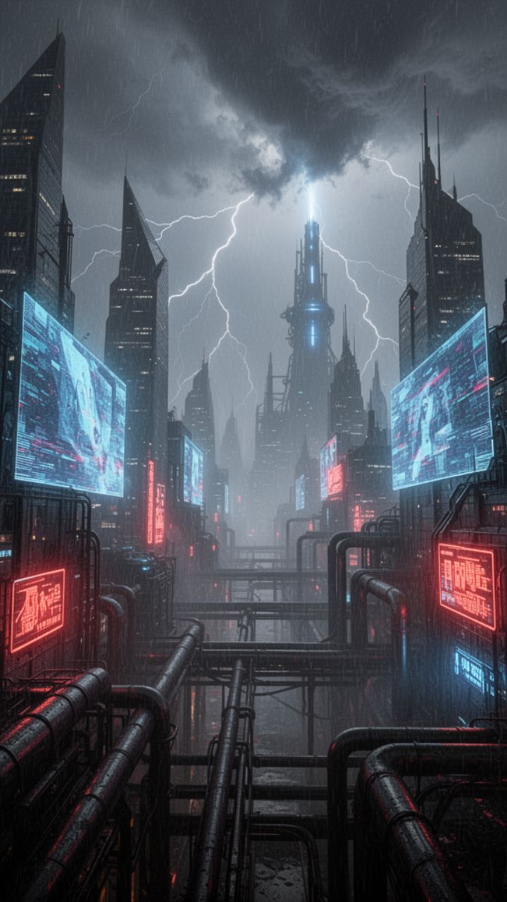 binary flood, rust in the wires, oil in the blood.