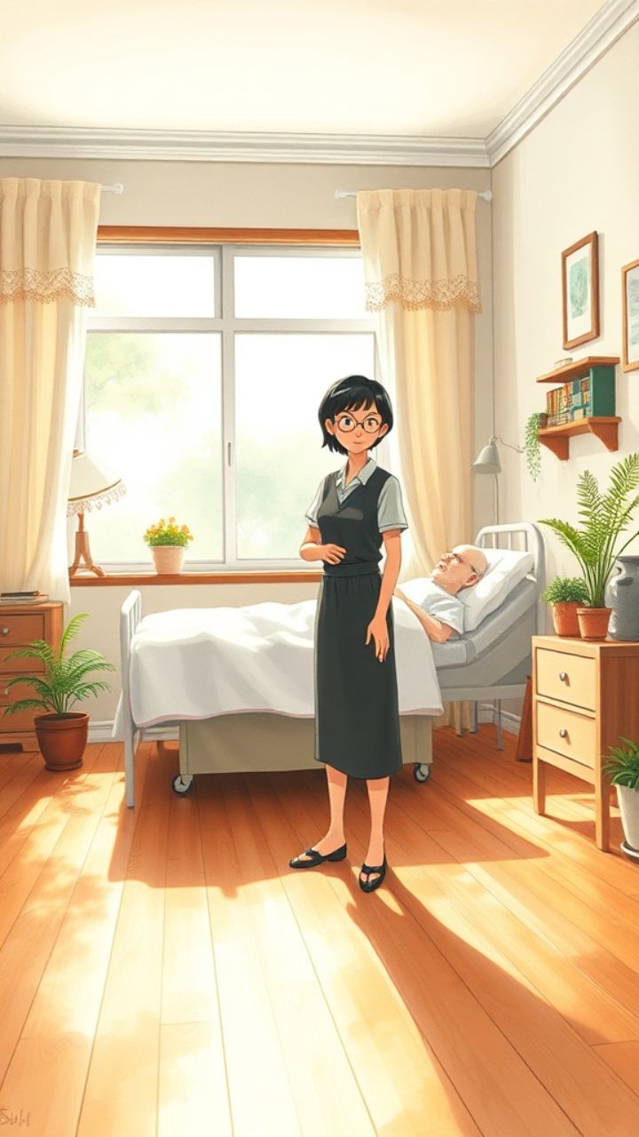 late einde. Helpt zij hem op toilet. Zij kust hem