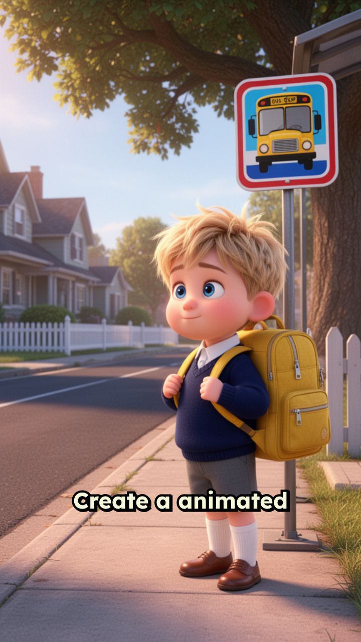 Create a animated video story in which a small boy is waiting for his school bus on a bus stop in