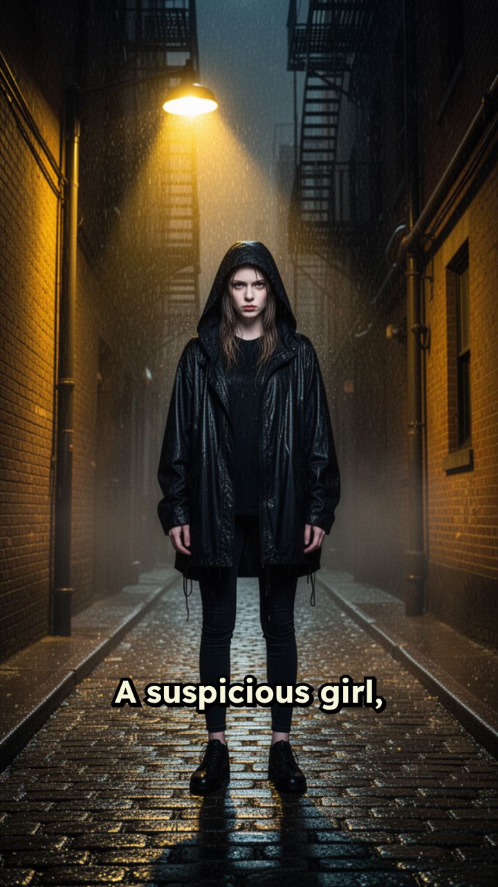 A suspicious girl, wearing a black hooded jacket and black pants, walking on streets