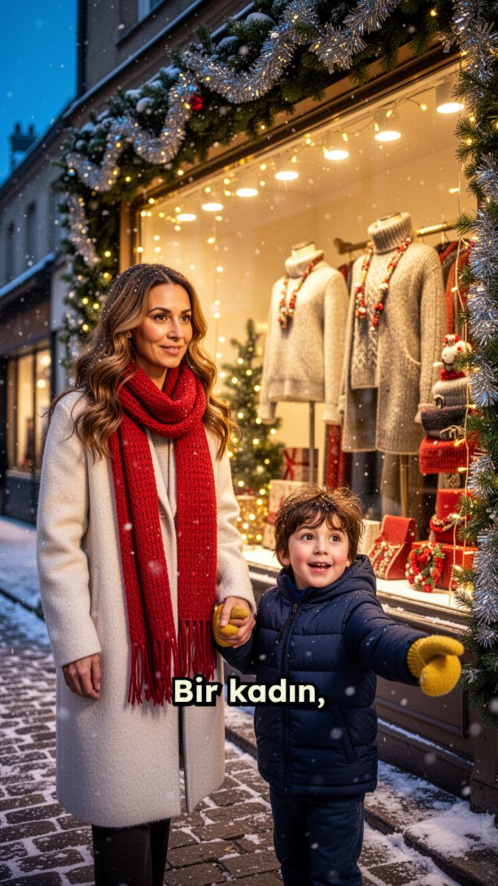Bir kadın, çocuğun elini tutar. Çocuk parmaklarıyla dükkânı gösterir. Yanlarında bir çift