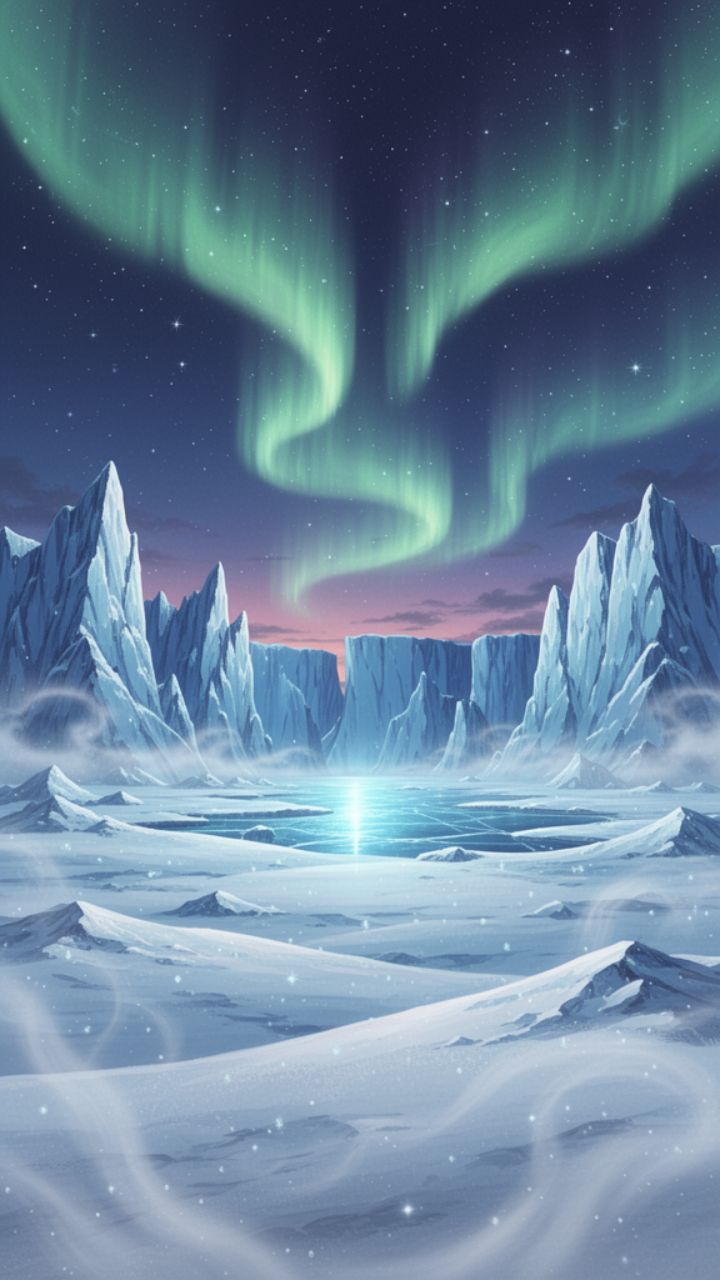 The aurora dances on the edge of the night. We're spawned in the snow,