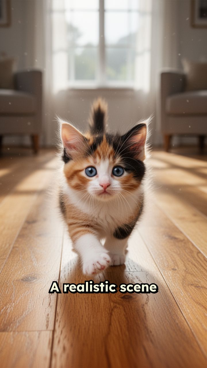 A realistic scene of a tiny fluffy kitten slowly walking on a wooden floor, discovering its