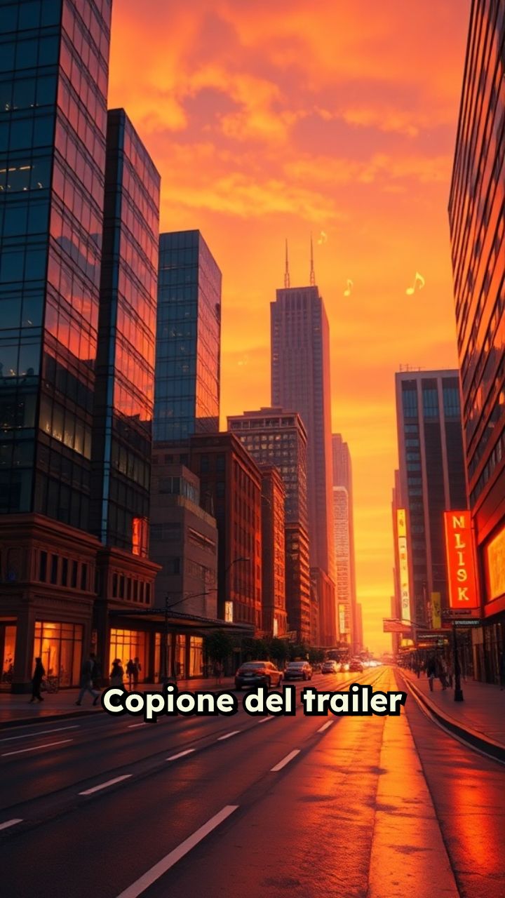 Copione del trailer (circa 60 secondi): Vista dall’alto della città al tramonto, con musica che parte