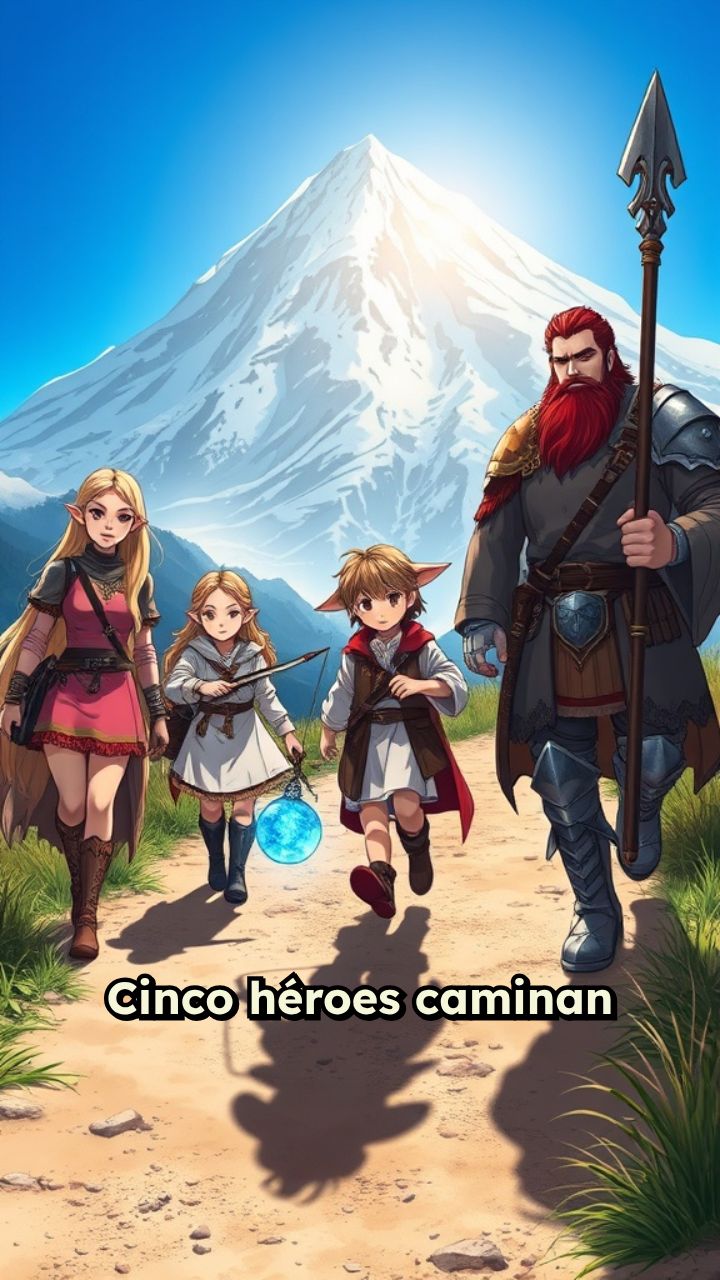 Cinco héroes caminan bajo la sombra de la montaña más alta del reino.