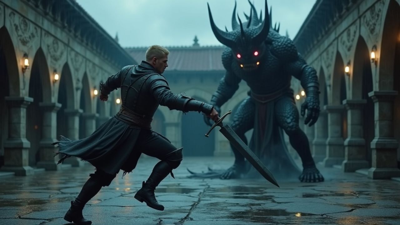 genere moi une cinematique avec ecrit commençement avec le quel un personnage se gette sur le monstre