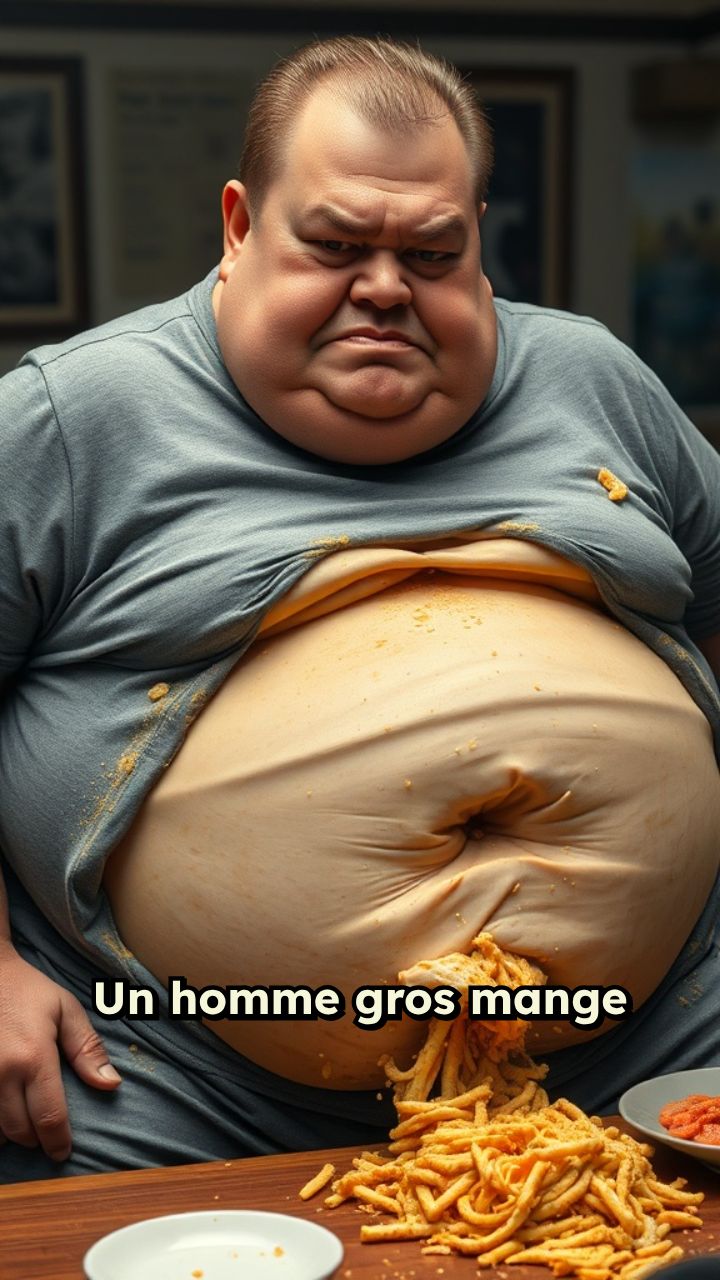 Un homme gros mange et son ventre grossi et explose avec plein de gras qui sort