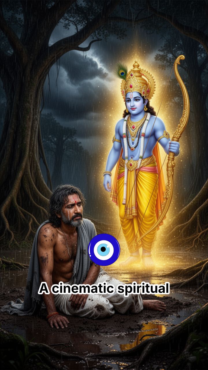 A cinematic spiritual scene where Lord Ram appears during a devotee’s hardest time.