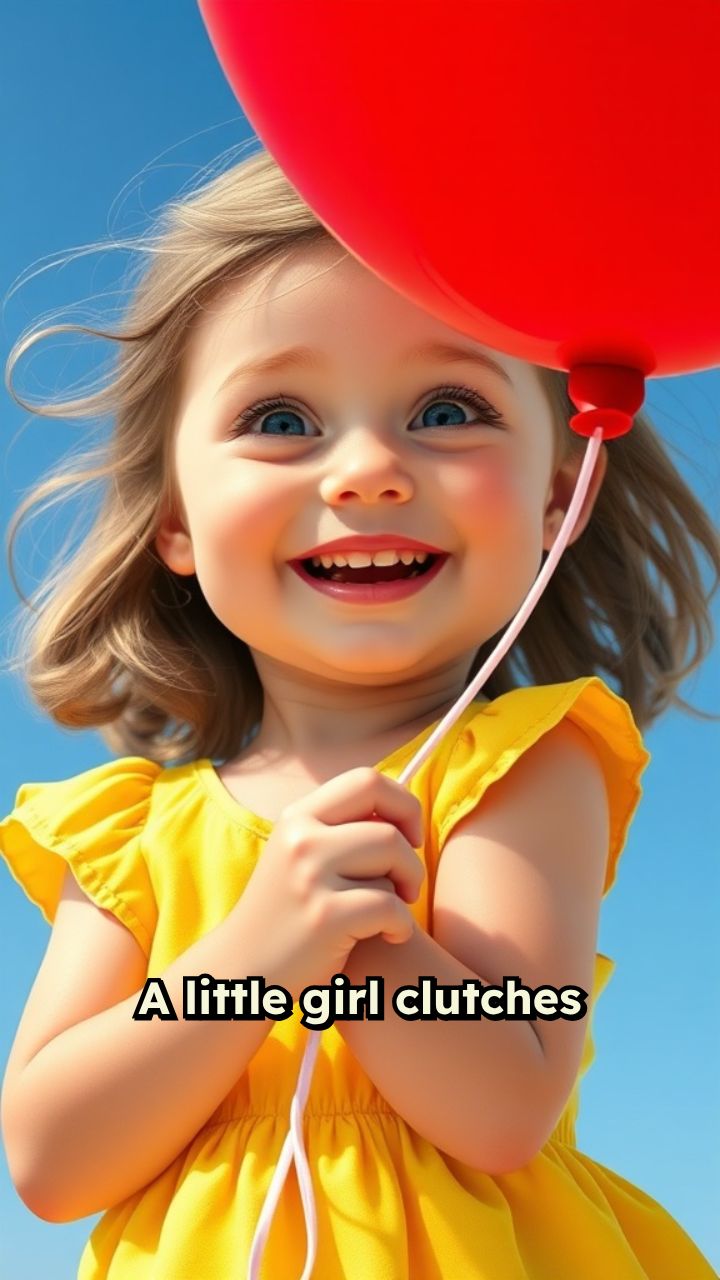 A little girl clutches her red balloon tight, laughing as it dances in the wind.