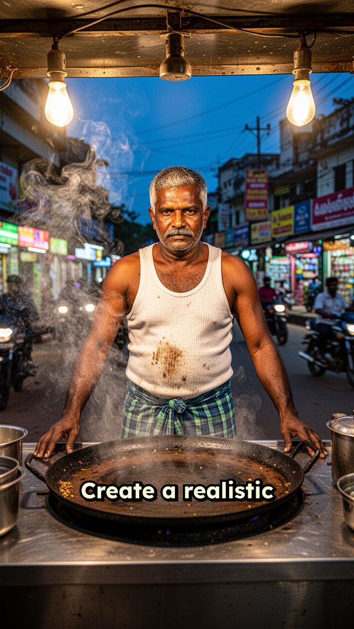 Create a realistic vertical mobile video of a South Indian street food vendor from Tamil