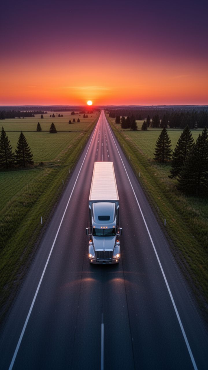 Słońce zachodzi, parking już śpi. Kabina buja się w rytmie dni. Silnik ucichł.