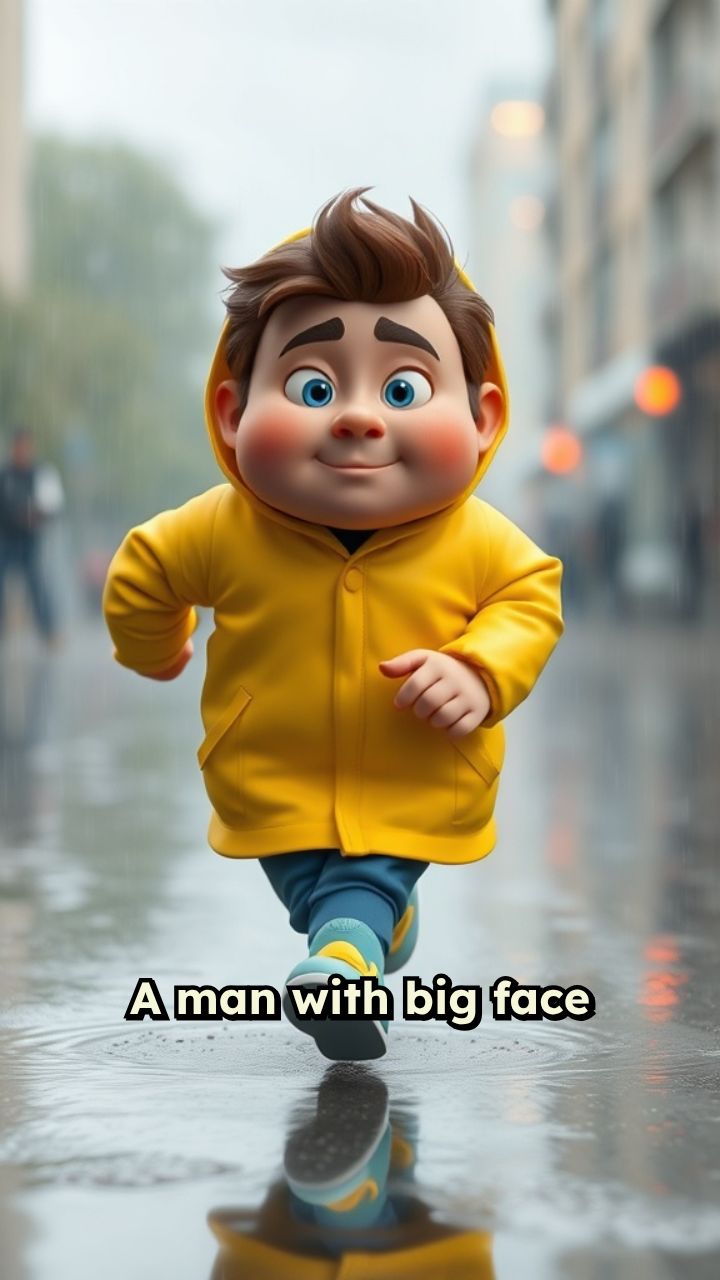 A man with big face running here and there in the rain
