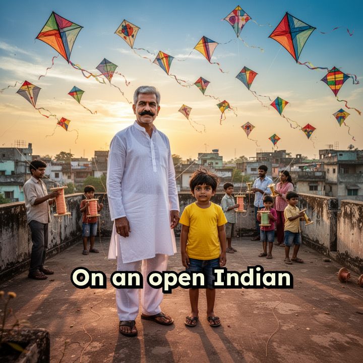 On an open Indian terrace, adults and children are casually interacting and flying kites