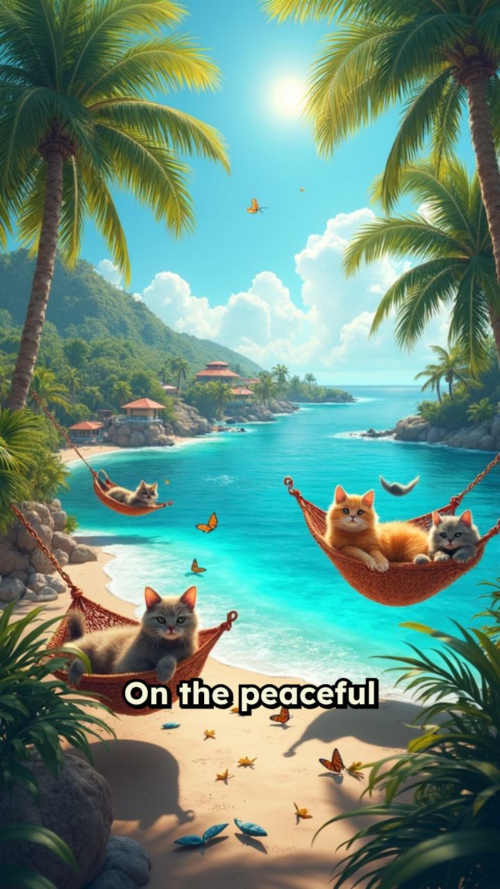 On the peaceful island of Meowtanu, cats nap in the sun, chase butterflies.