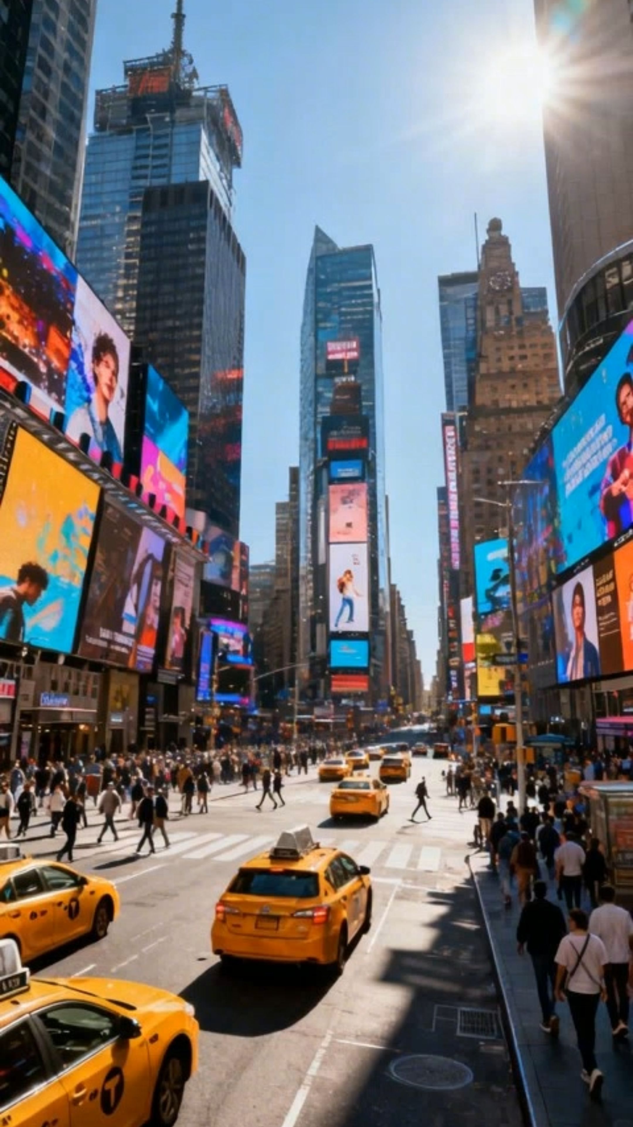 clothing: constant, hat; lighting: daylight; transitions: continuity; setting: Times Square