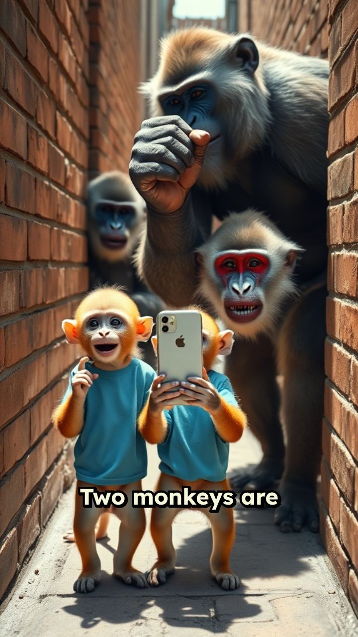 Two monkeys are talking at phone call three goon monkey snatch the mobile phone after