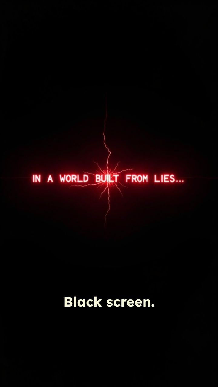 Black screen. GLITCH SPARK. "IN A WORLD BUILT FROM LIES…" Comic chaos.