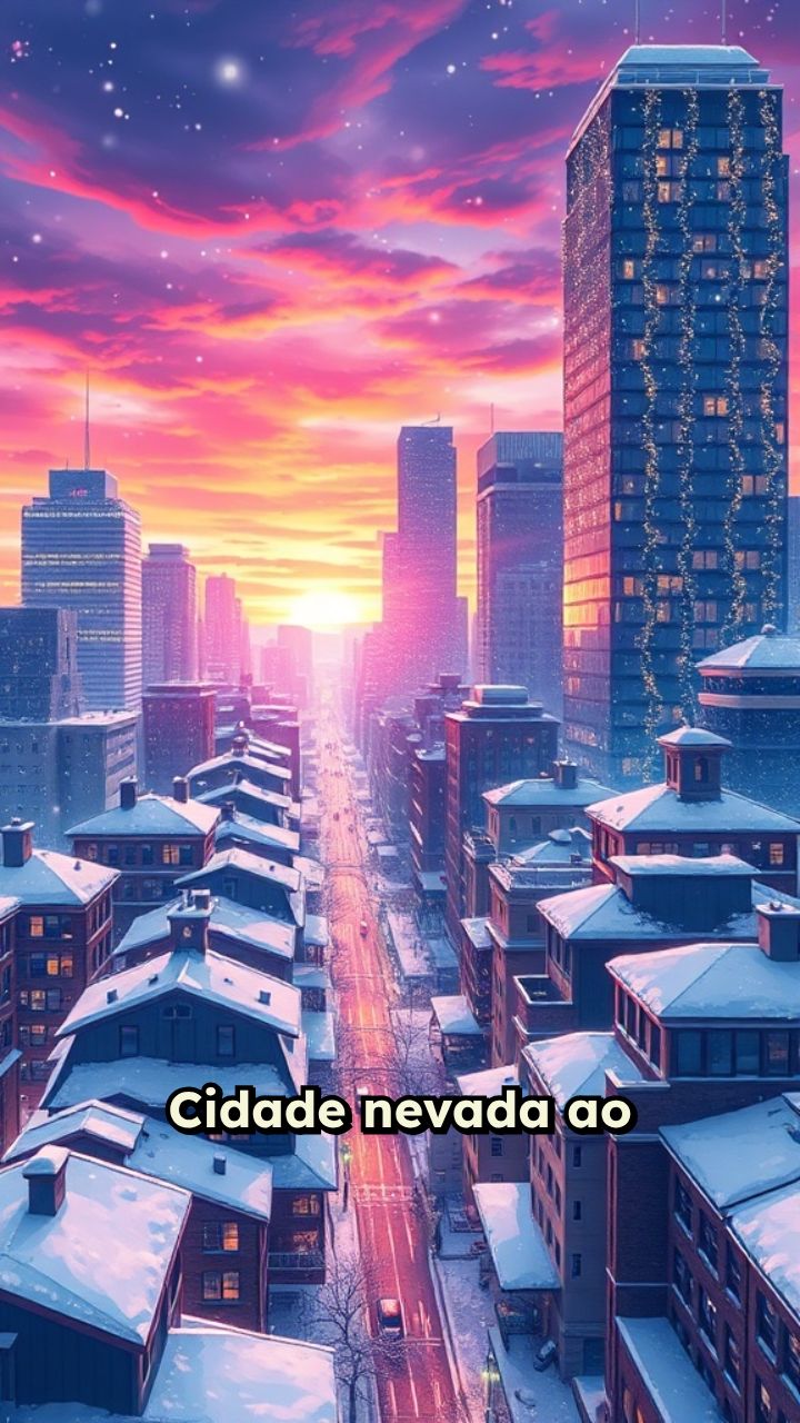 Cidade nevada ao entardecer, com luzes de Natal refletindo nos prédios. O Herói das Teias