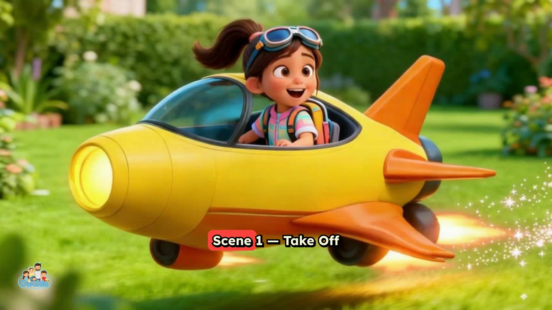 Scene 1 — Take Off (0:00–0:03) Visual Prompt: tiny girl 7, small flying plane,