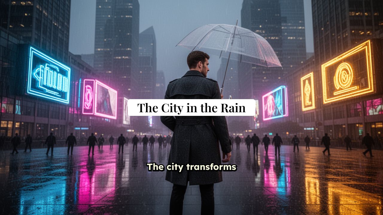 The city transforms into a liquid masterpiece when the evening rain begins to fall.