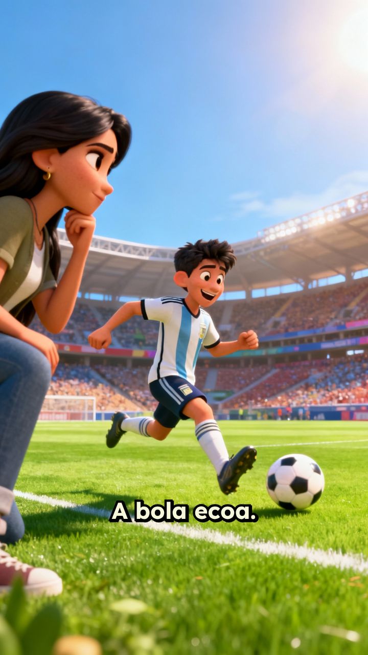 A bola ecoa. Ele joga com alegria, e nas arquibancadas, ela observa —