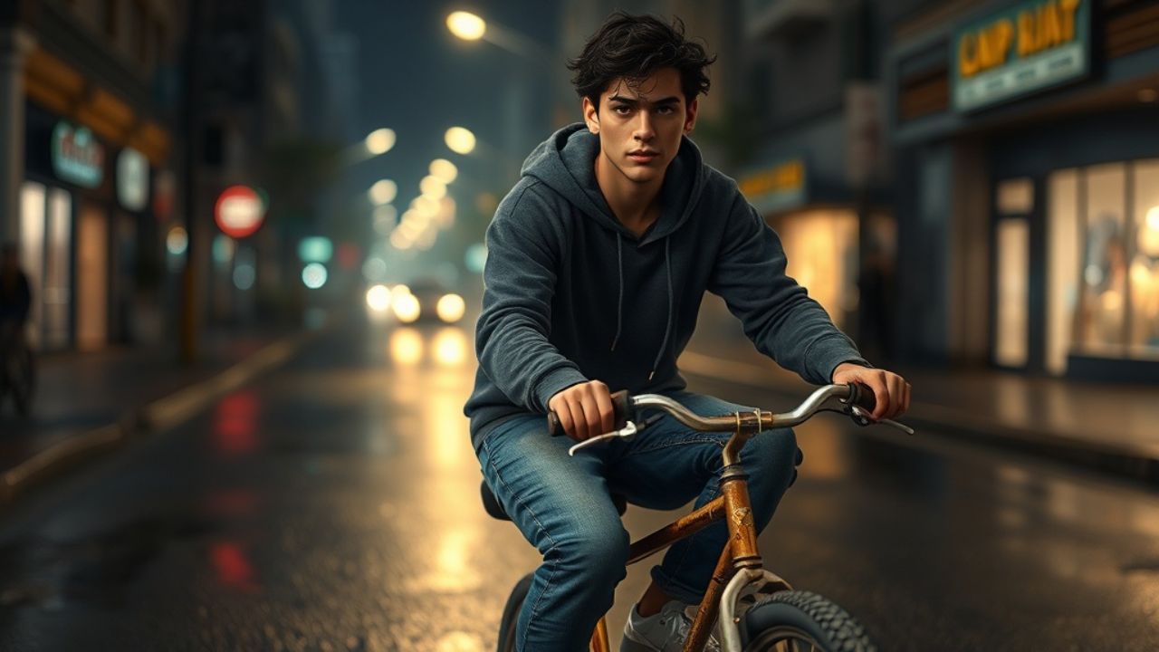 Diecisiete años y una bicicleta prestada. Buscando una fiesta por la calle mojada.