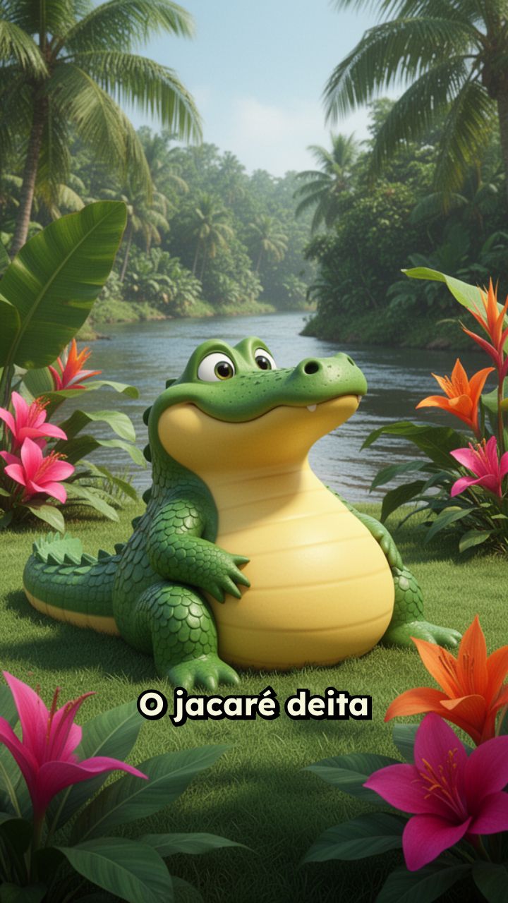 O jacaré deita no chão, Barriga pra cima, que preguição! Ele dorme,