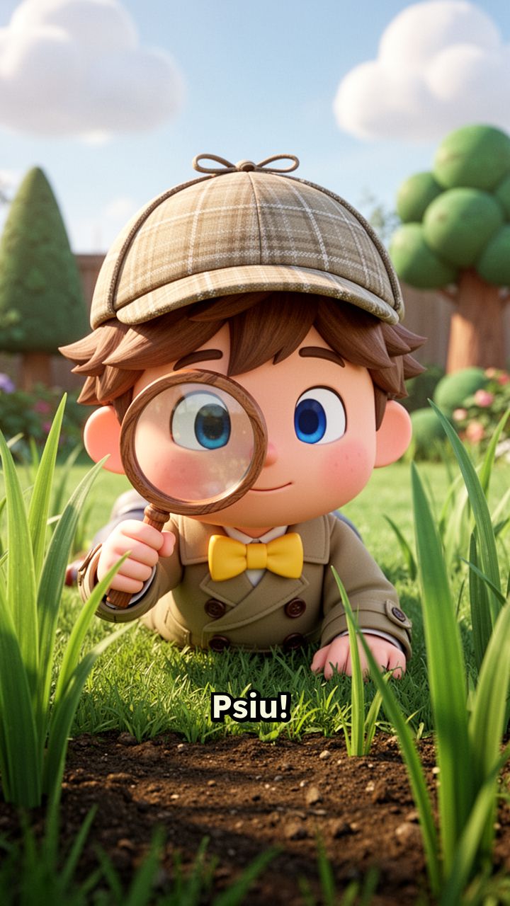 mas é só a grama do jardim. Pista número um! <break time="0.5s" /> Olhem aquela folha. Ela está andando
