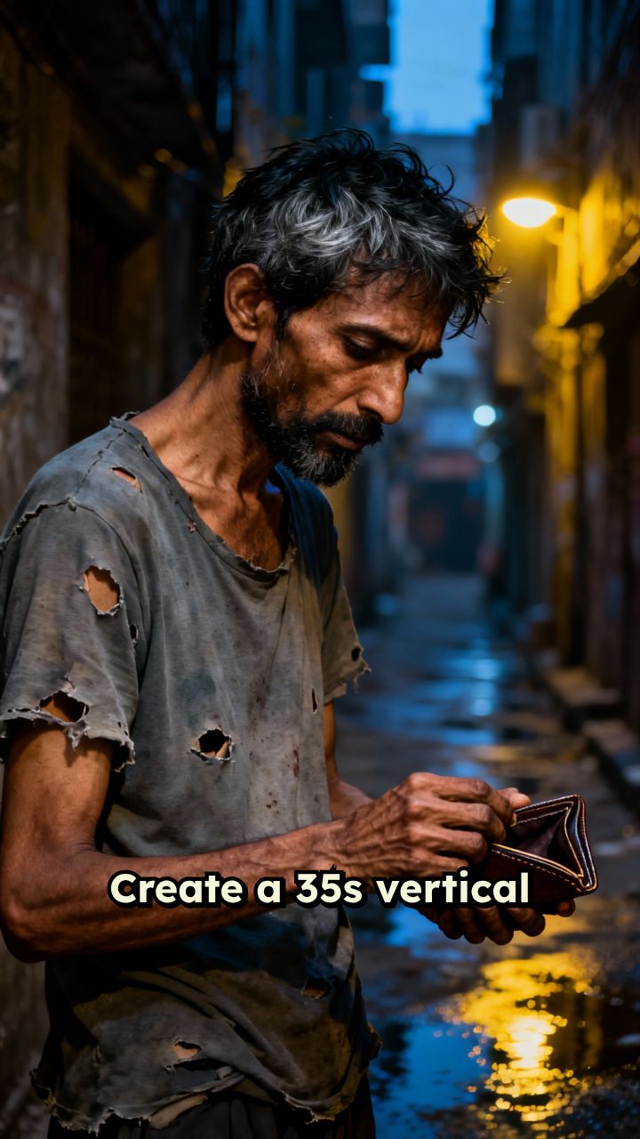 Create a 35s vertical TikTok video. Hook in first 2 seconds: “He was broke.”