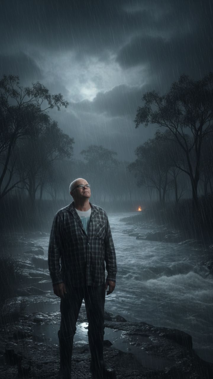 It's still raining. I ain't complaining. My shirt hangs heavy, boots full of