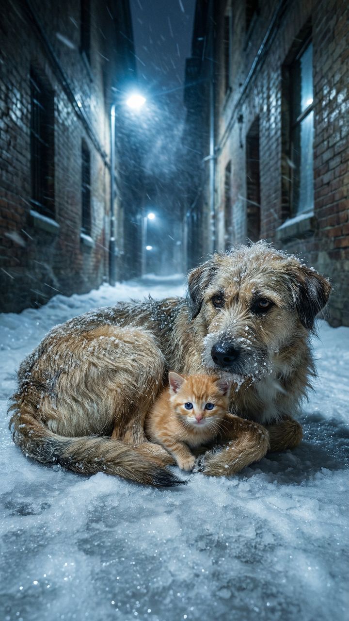 Perro callejero protege a gatito en nieve