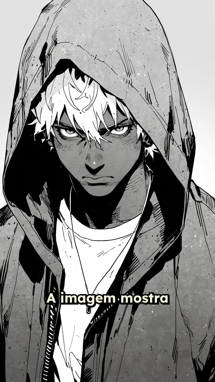 A imagem mostra um personagem de pele escura com cabelo afro branco sob um capuz preto.