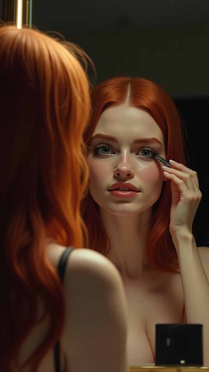 Wake up, fake glow, mirror talk. Redhead eyes under perfect gloss.