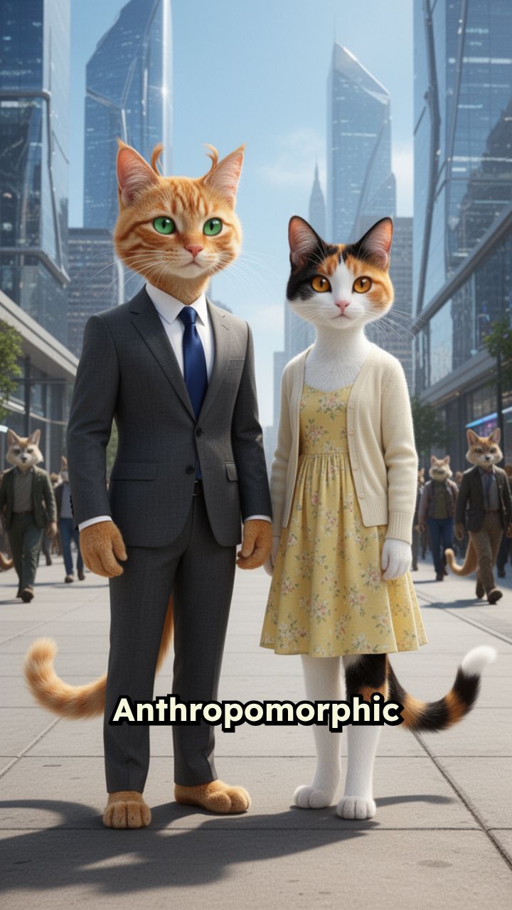 Anthropomorphic cat man and CATf WOMAN living like humans in a modern city.