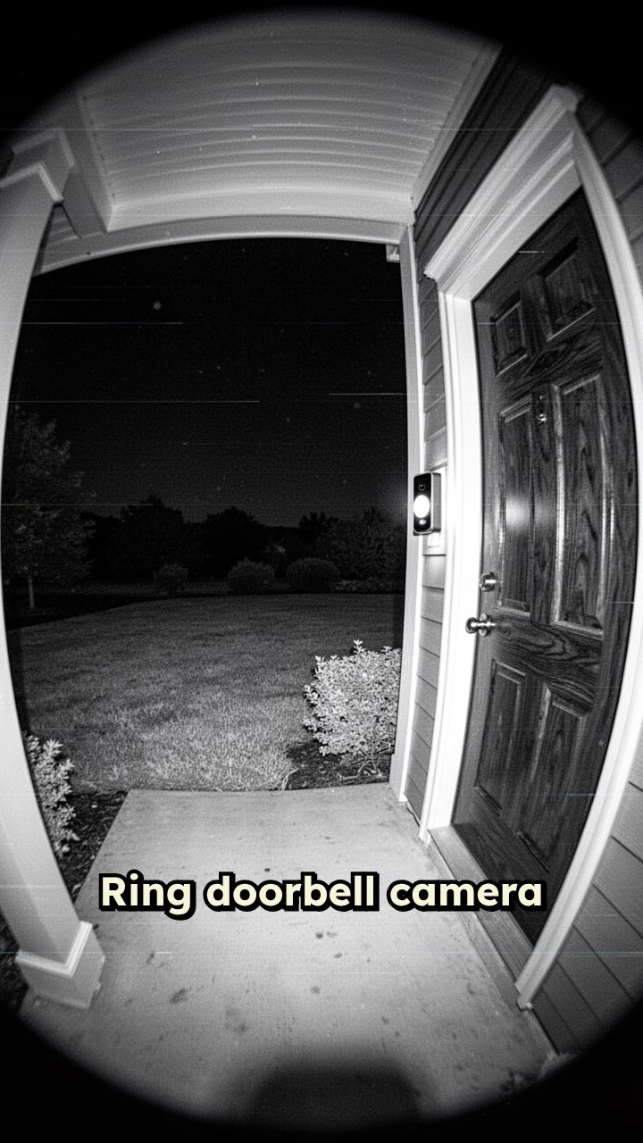 Slight fisheye lens, infrared night vision, timestamp overlay, realistic security camera quality.