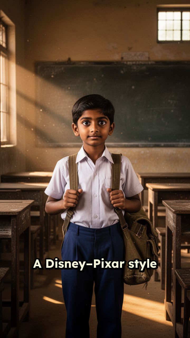 A Disney–Pixar style Indian school boy named Rahul, age 10–12, slim body,