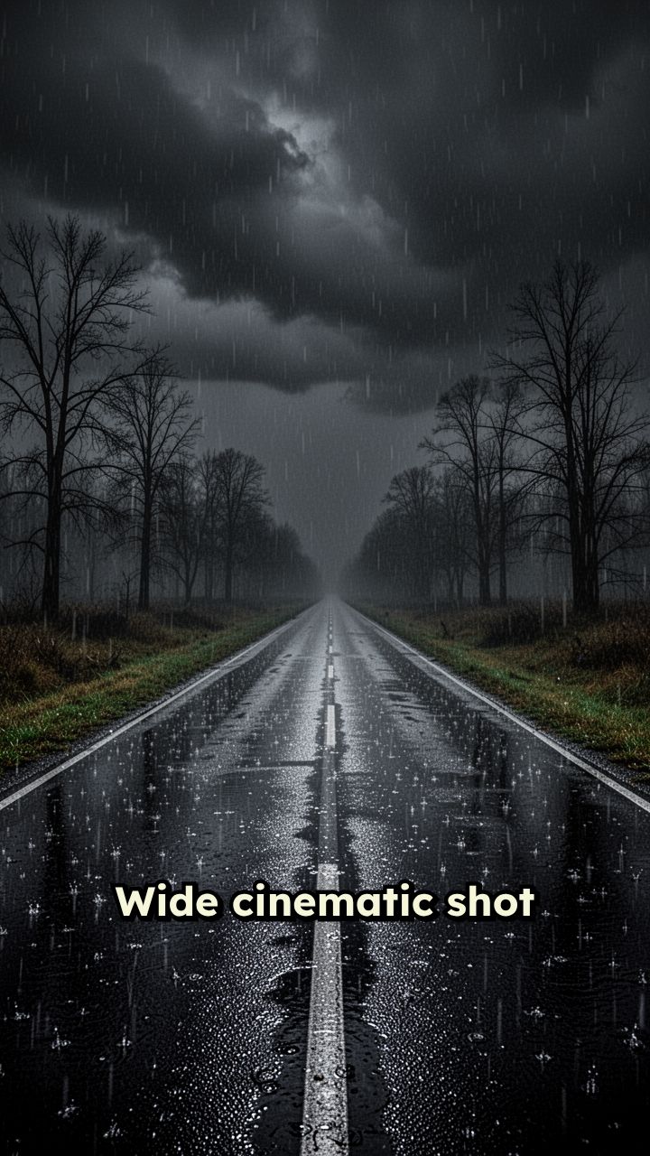 Wide cinematic shot of an empty road at night, heavy rain falling, yellow streetlight