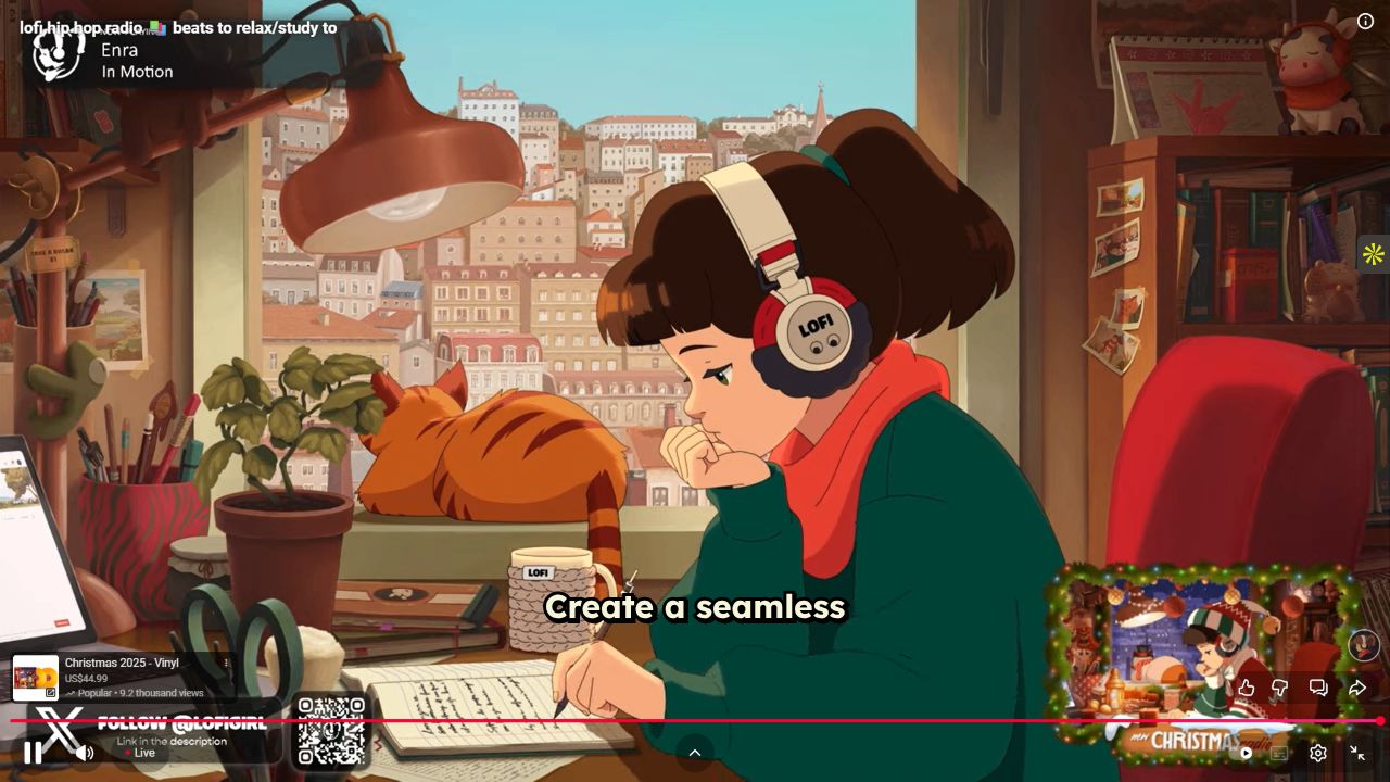 Relax with this seamless lofi anime rain loop featuring a girl at her desk and a sleeping cat. Perfect for creating a peaceful study or sleep environment.