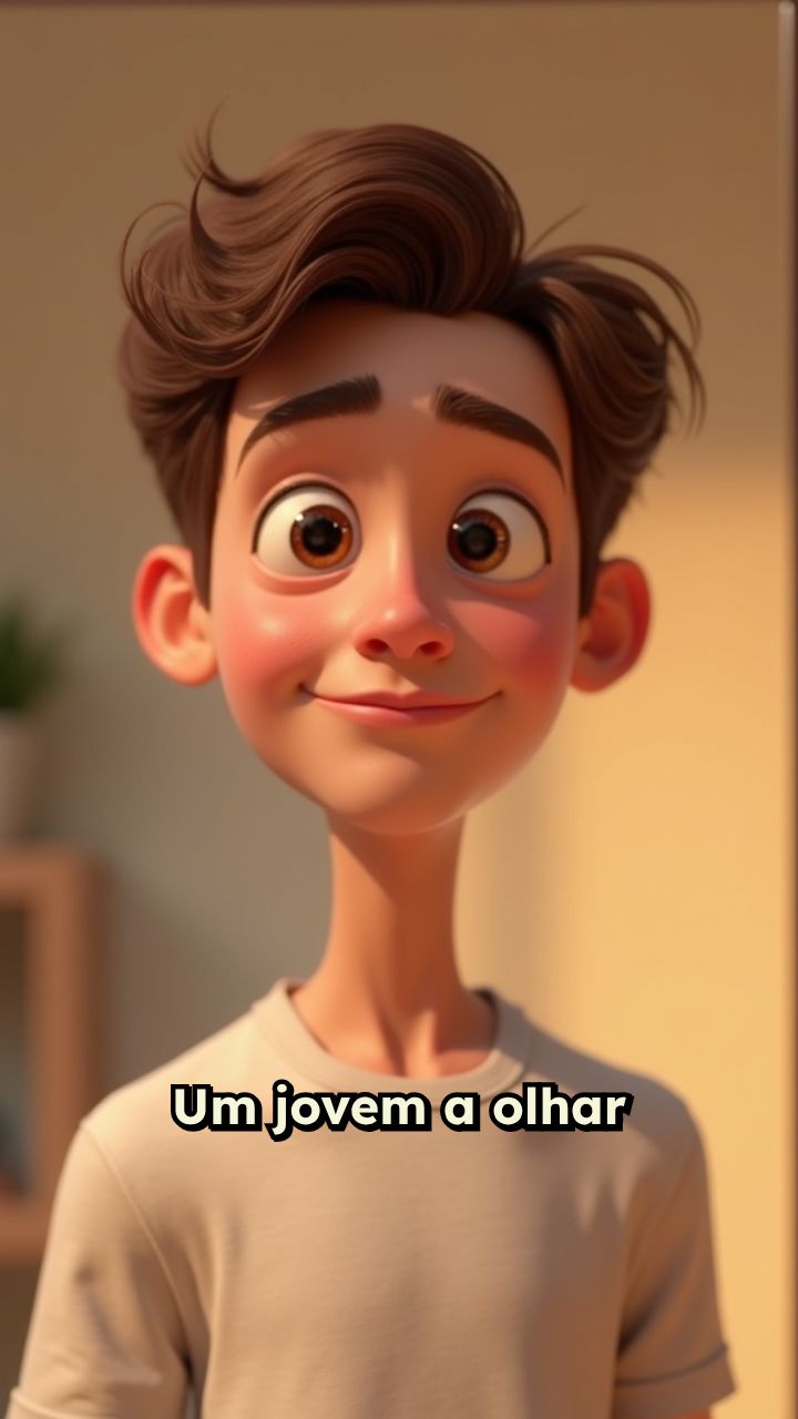 Um jovem a olhar para o espelho com cabelo castanho aos caracois. e diz “sou eu,sou