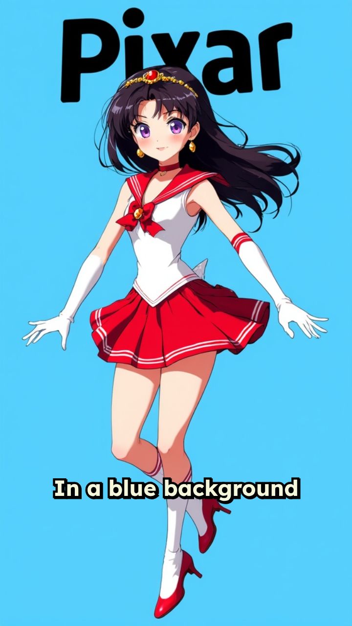 In a blue background there is a black text that’s says Pixar with sailor mars bouncing on