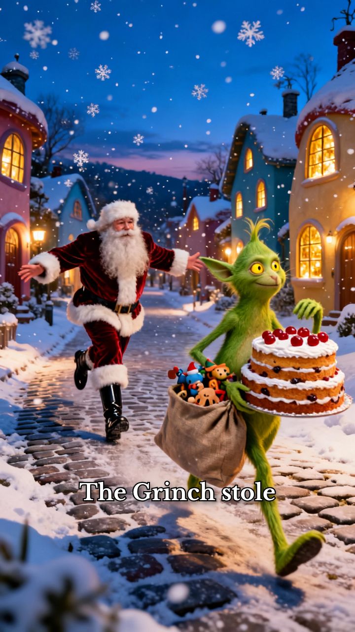 The Grinch stole the Christmas cake and toys and runs away whilst Santa chases him.