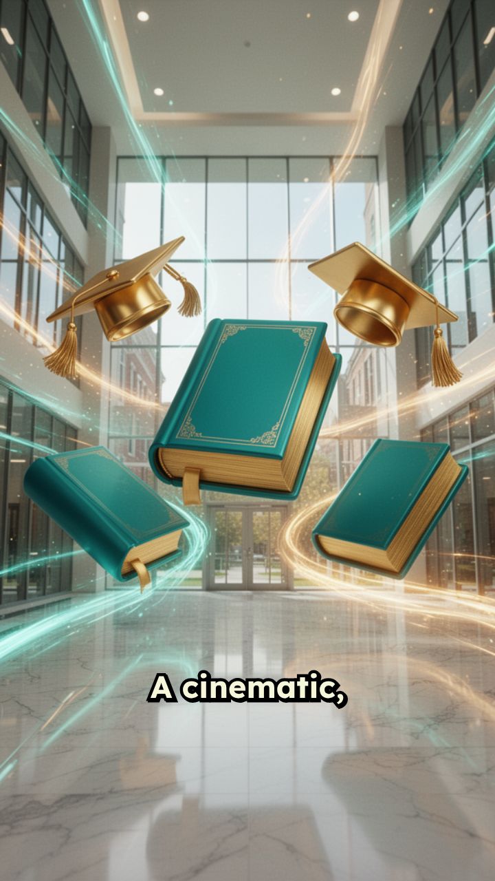 Include 3D floating icons of books, calculators, and graduation caps. End with a "Register