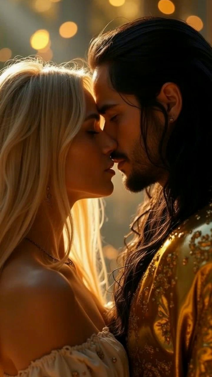 A blond woman in her 30s with long blonde hair kisses a white man with long black hair