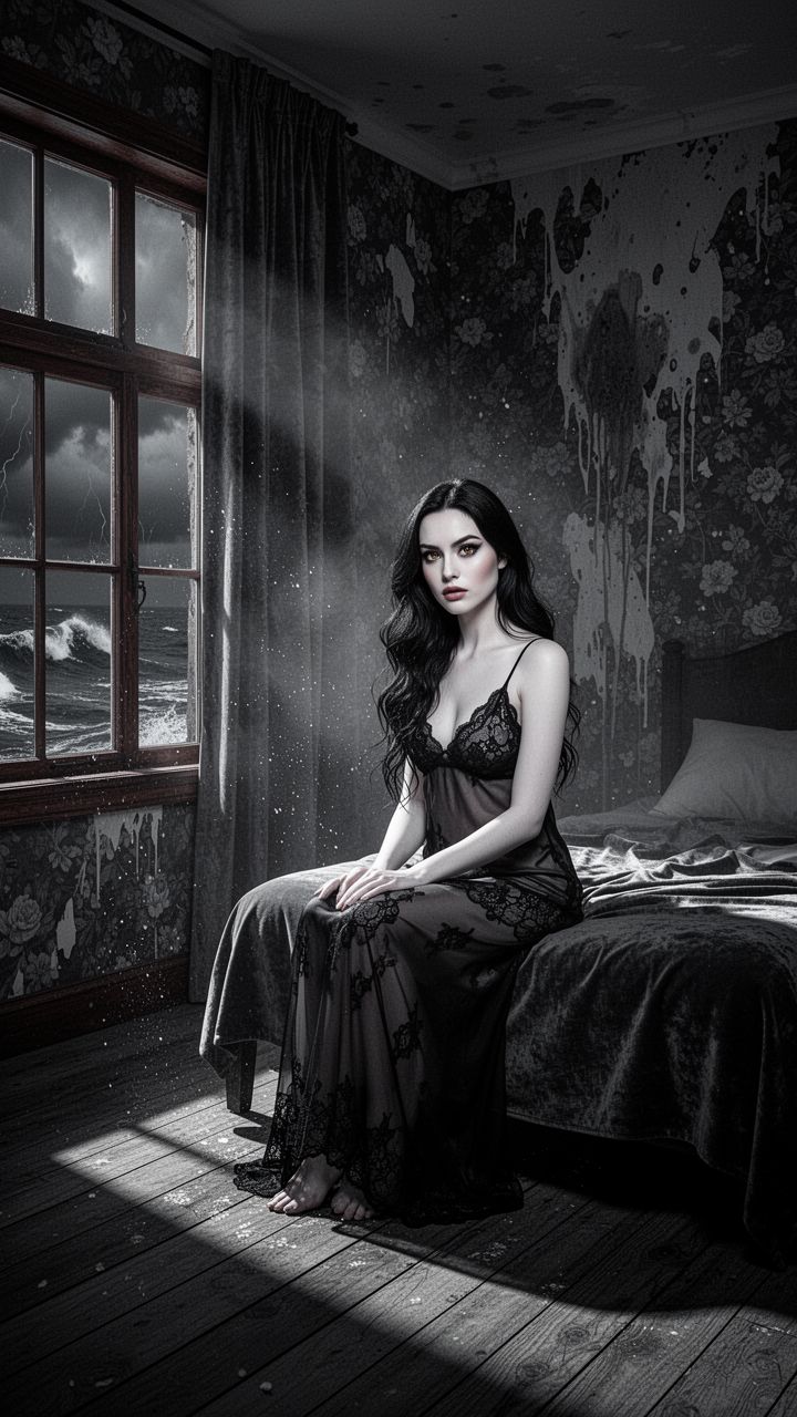 Cinematic erotic-horror reel in a coastal-damp bedroom at night: salt-heavy air, faint TV hum,