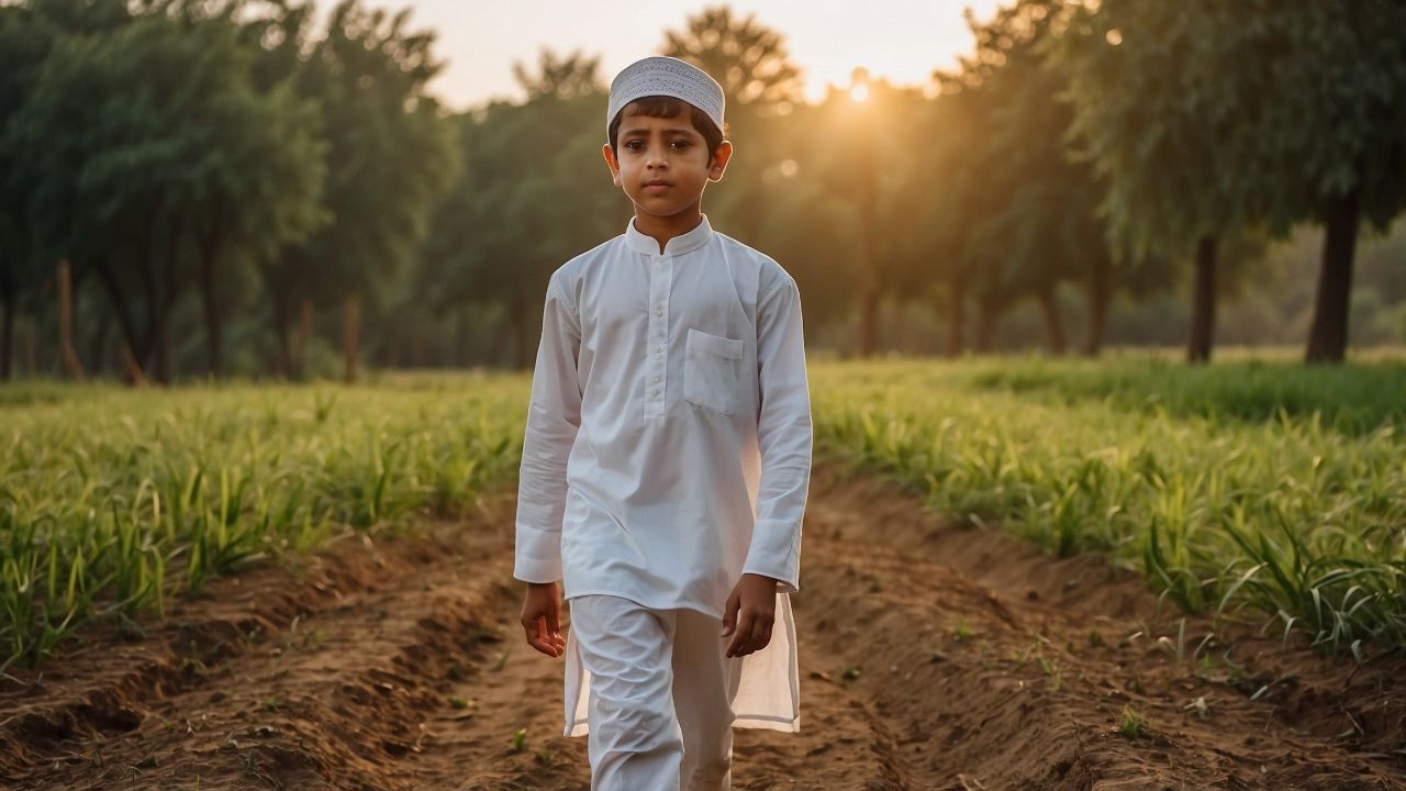 This cinematic Islamic video captures pure spiritual beauty. A young Muslim boy in white kurta walks