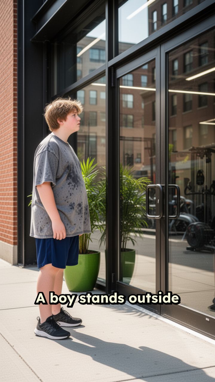 A boy stands outside a gym, looking at the glass door. Inside,