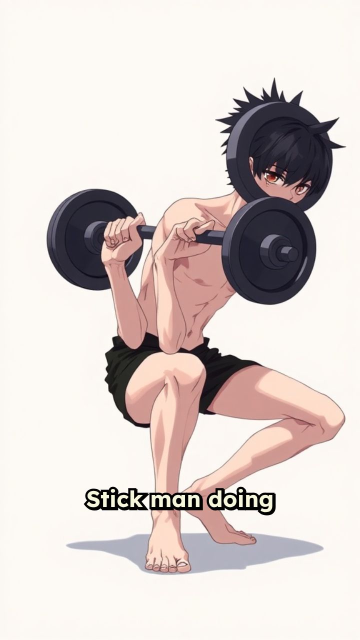 Stick man doing squats with a black weighted barbell on a plain background