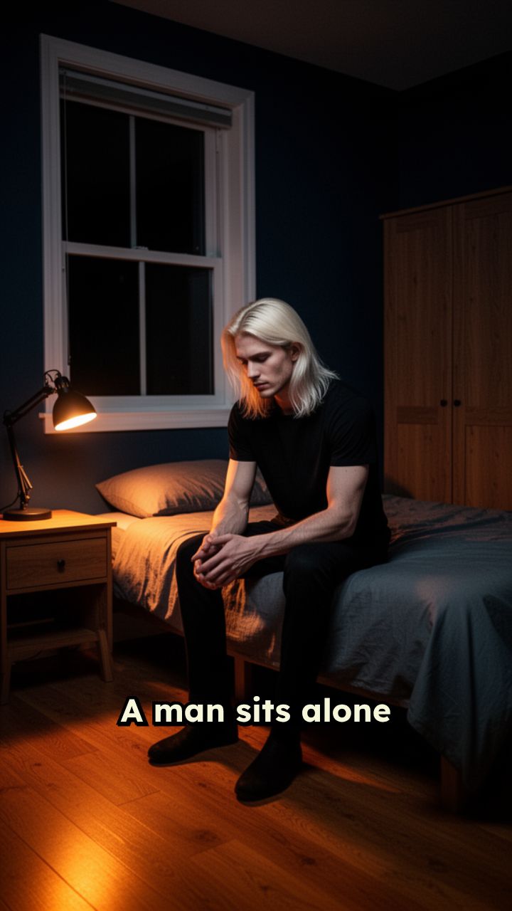 A man sits alone in his room at night. No background music. Only the slow sound of a ceiling fan.